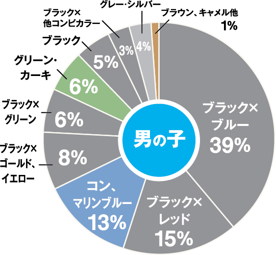 クロ系が76%、中でもステッチに青や赤など配色にアクセントがあるものが人気。他にも、ブルーやグリーン、シルバーなど個性派カラーも人気上昇中。