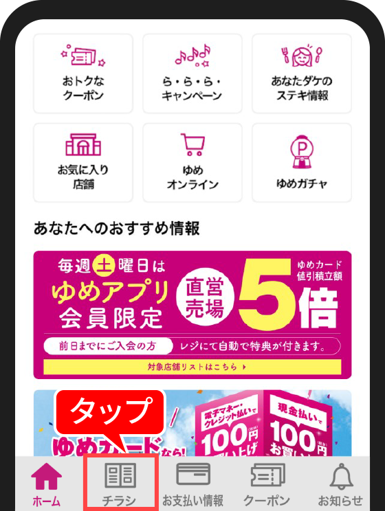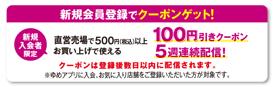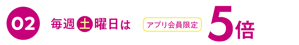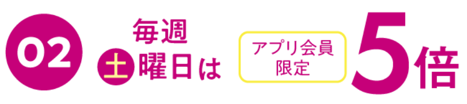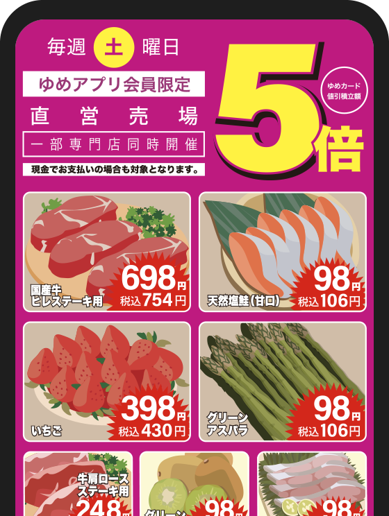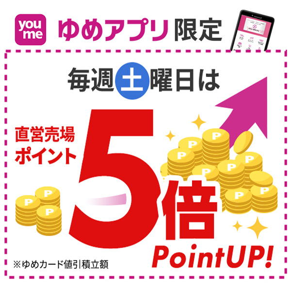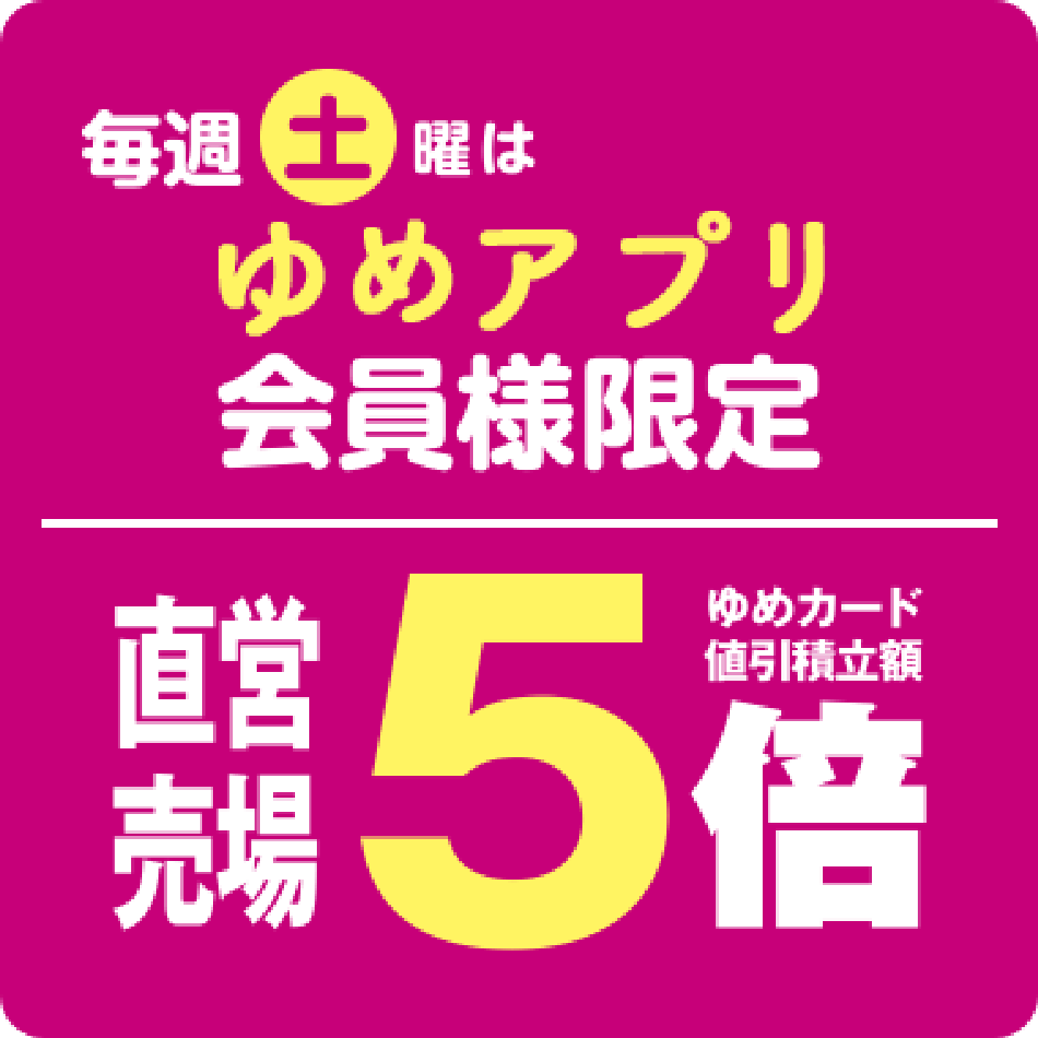 毎週土曜日は、ゆめアプリ会員様限定!直営売場でのお買い物は、値引積立額が通常の5倍付与されます。