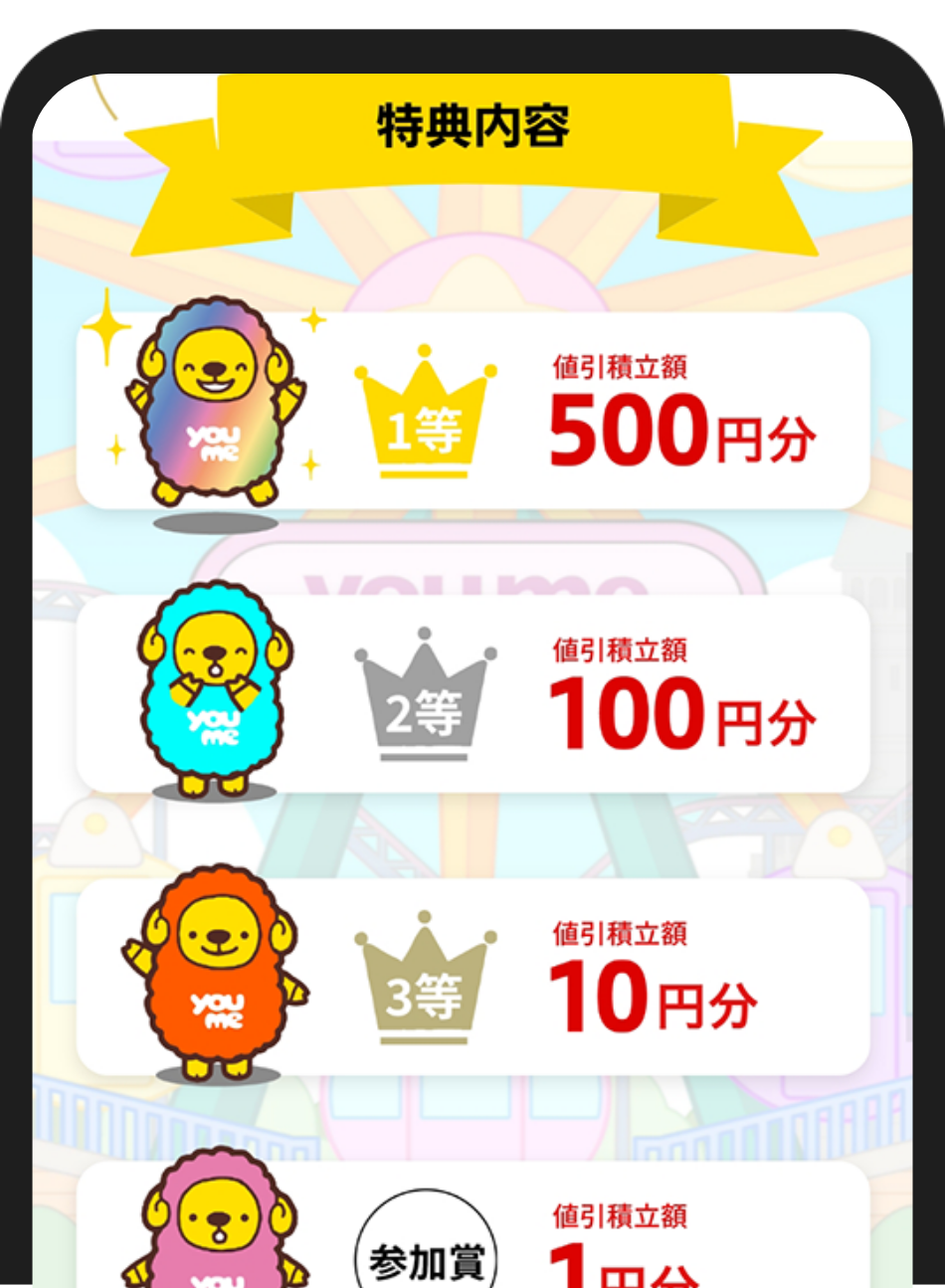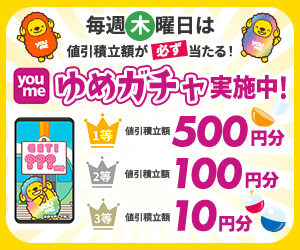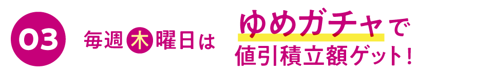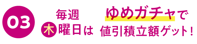 毎週木曜日にゆめアプリにログインすると、もれなく値引積立額が当たるゆめガチャにご参加いただけます。