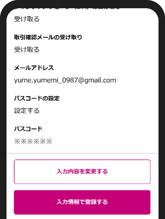 入力内容をご確認の上「入力情報で登録する」を選択。「設定画面へ」をタップします。