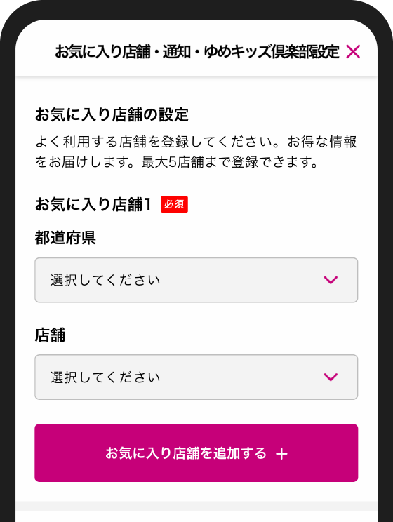 お気に入り店舗、プッシュ通知、ゆめキッズ倶楽部の入会設定を行ってください。