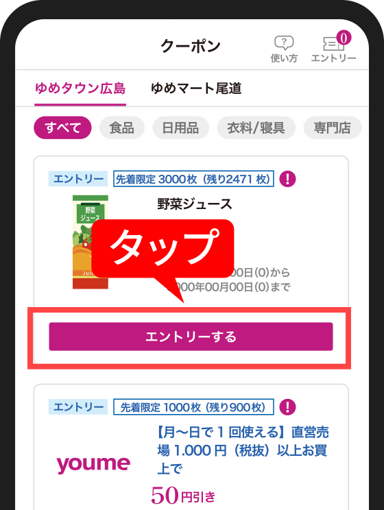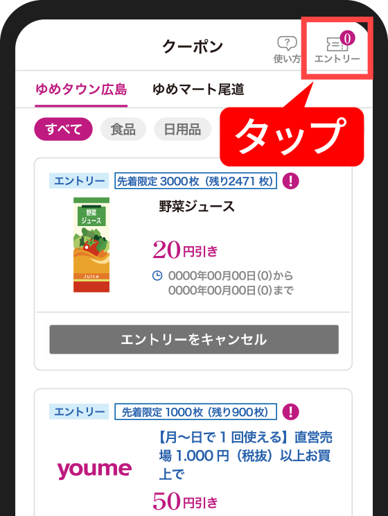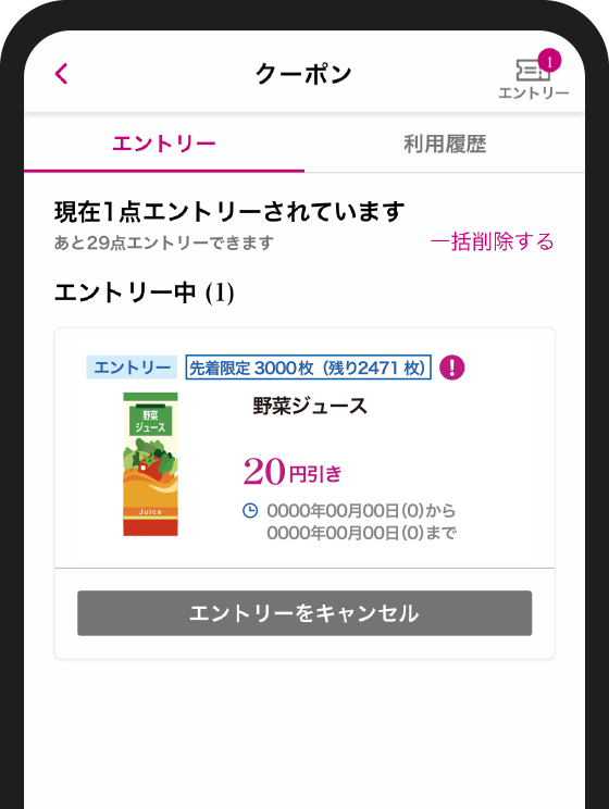 エントリーしたクーポンはクーポン画面の「エントリー」を選択して、ご確認いただけます。