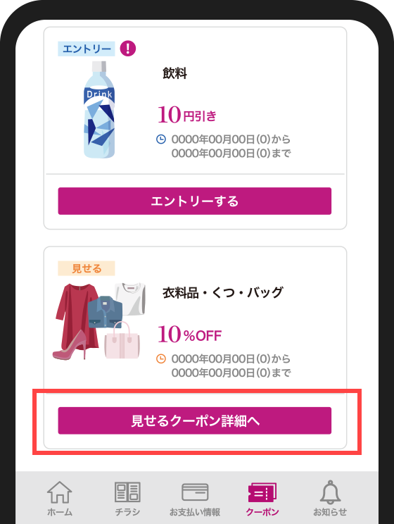 クーポン画面で「見せるクーポン詳細へ」と記載されているクーポンが対象です。