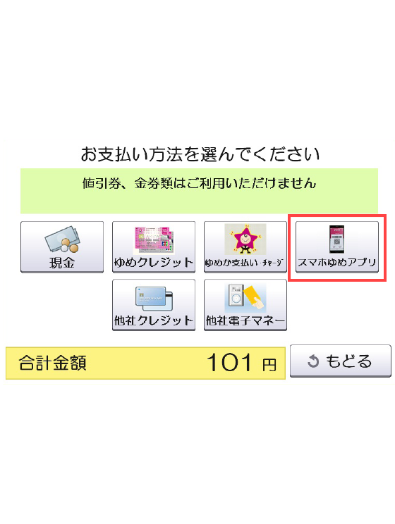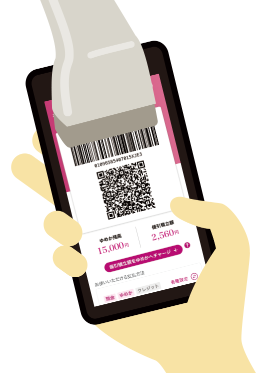 ※ご提示を忘れた場合、会計機にて「スマホゆめアプリ」を選択いただくとハンドスキャナでの読み取りも可能です。