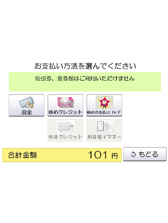現金、ゆめかクレジット、ゆめかの3種類の決済方法を選べます。