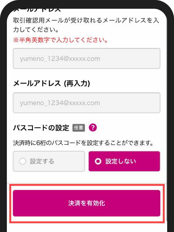お客様情報を登録し「決済を有効化」をタップすると設定完了です。