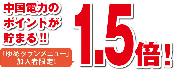 『ゆめカードをお持ちの方』は毎月の電気料金に応じて 毎月の電気料金に応じてポイントが貯まります!(200円につき1ポイント) 500エネルギアポイントは 500円分 「ゆめか」にチャージできる! ※電子マネー「ゆめか」へのチャージは、100円単位で実施可能です。 770エネルギアポイントは 500円分「商品券」に交換! 1,270エネルギアポイントなら1,000円分「商品券」に交換! ※「商品券」への交換は、500円または1,000円単位で実施可能です。 中国電力のに ご登録が必要となります。