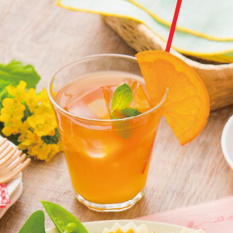 グラスにジュース、氷を入れ、紅茶を氷に当てながらゆっくり注ぐ。