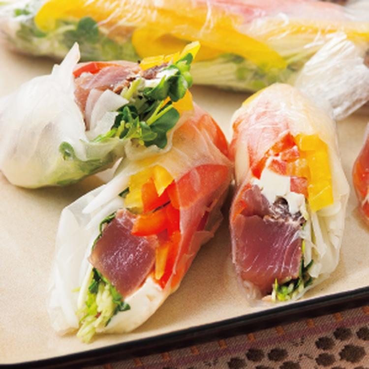 巻きすの上に水にくぐらせた生春巻きの皮をのせ、(1) 、Aを順に重ねて巻き、両サイドは押し込む。巻き終わったらラップで包んでおく(包丁で切りやすく、時間が立っても崩れにくい)。