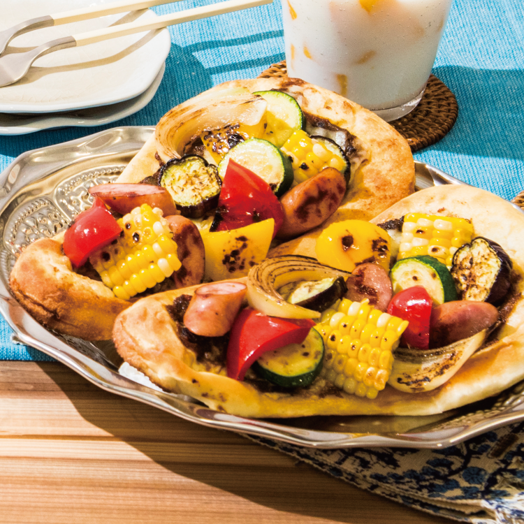 (3)のナンに彩りよく(1)をトッピングして、いただく。