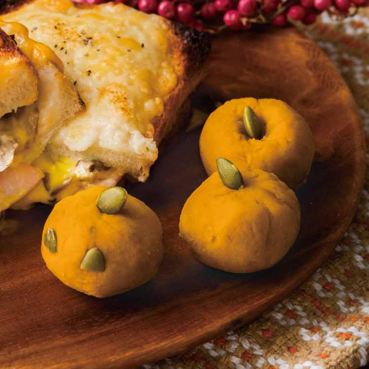 ラップを外し、かぼちゃの種を半分に切っておばけの目を作り、さらにかぼちゃの種を上にのせてクロックムッシュに添える。
