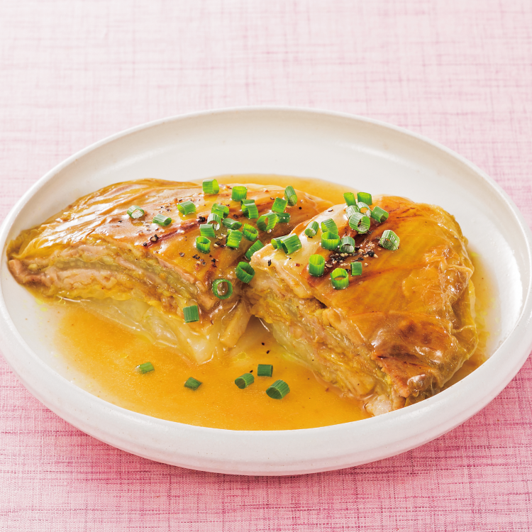 白菜は葉を1枚ずつはがし、厚手の鍋に1/5量を広げて片栗粉を薄く振り、1/4量の豚肉をのせて1/4量の混ぜ合わせたAを塗る。これを計4回繰り返し、最後に残りの白菜をのせる。