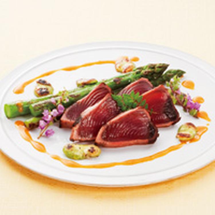 器に(2)・カツオを盛り、(1)をかけて木の芽・花穂しそを添える。