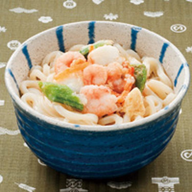 うどんはパッケージ通りにゆでて水でしめて器に盛り、(1)をのせる。