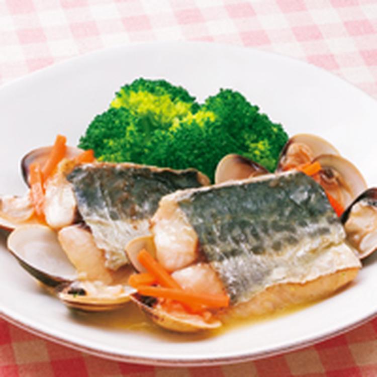 フライパンにバター小さじ2とサラダ油を中火で熱し、(1)を両面こんがりと焼く。白ワイン・洗ったハマグリ・ブロッコリー・人参を加えて蓋をし、約4分蒸し焼きにして器に盛る。