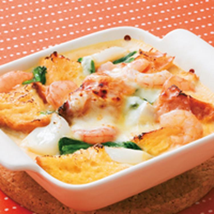 耐熱皿に(1)・汁気を切ったシーフードミックス・バゲットを並べて(2)を流し入れ、チーズをのせてオーブントースターで約20分こんがりと焼く。途中で焦げ目が付いたらアルミホイルをフワッとかぶせて更に焼く。