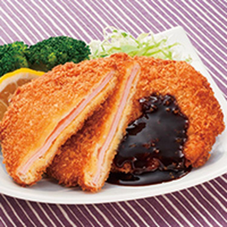 ハムは2枚ずつ重ねて小麦粉・溶き卵・パン粉の順につけ、更に溶き卵・パン粉をつける。170℃に熱した揚げ油でカラリと揚げる。