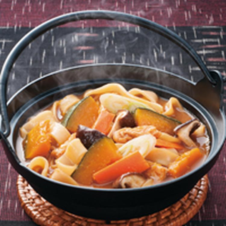かぼちゃが柔らかくなったら、みりん・みそを溶き入れ、きしめんと白ねぎを加えてさっと煮て火を止める。