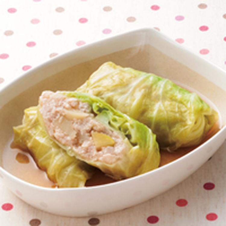 (1)のキャベツの葉1枚を広げ、(3)の1/8量をのせて手前からきっちり包む。同様にして計8個作る。