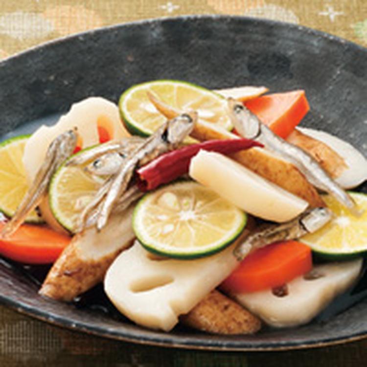 ごぼうと人参は約20秒ゆでて(1)に加え、同じ熱湯に酢(分量外)を加えてれんこんを約1分ゆでて(1)に加える。