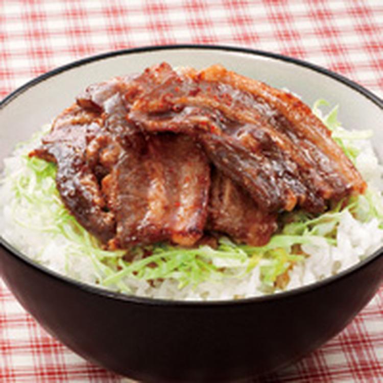 ご飯をよそってキャベツ・(2)の順にのせてタレをかけ、七味唐辛子をふってレモンを絞る。