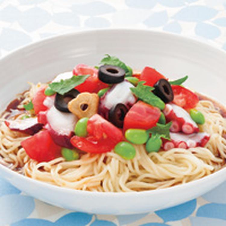 パッケージ通りにゆでて水でしめた麺・Aを盛り、(2)をかけて大葉をのせる。