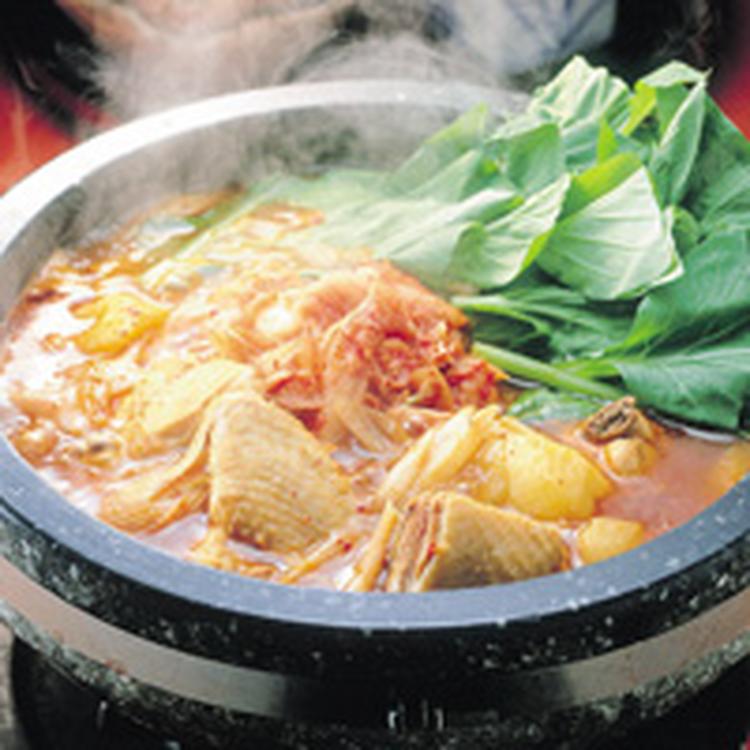 石鍋にごま油を熱して(4)を加え、香りが出たら(5)の白ねぎを入れて少し焦げ目がつくまで炒める。(1)、(3)、(5)のキムチ、Bを入れて煮込む。沸騰したら塩、こしょうで調味し、小松菜を加えて火を止める。