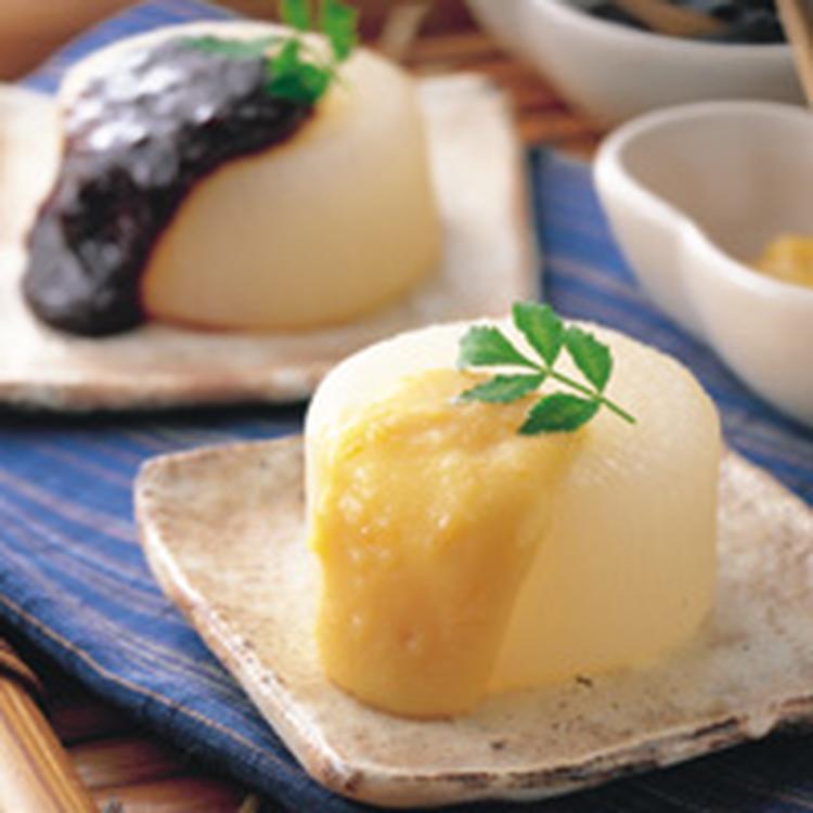 器に大根を盛り、あれば木の芽を飾る。それぞれの味噌でいただく。