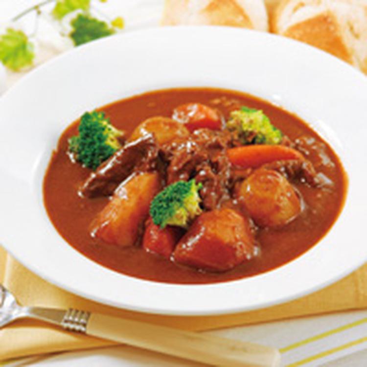 牛肉の長さを食べやすく切る。フライパンにバター大さじ1を入れて熱し、強火で牛肉をさっと炒める。肉の色が変わったら赤ワインを加えてアルコール分を飛ばし、(1)のソースとスープを加えて煮る。(アクが出てきたら丁寧にすくう。)