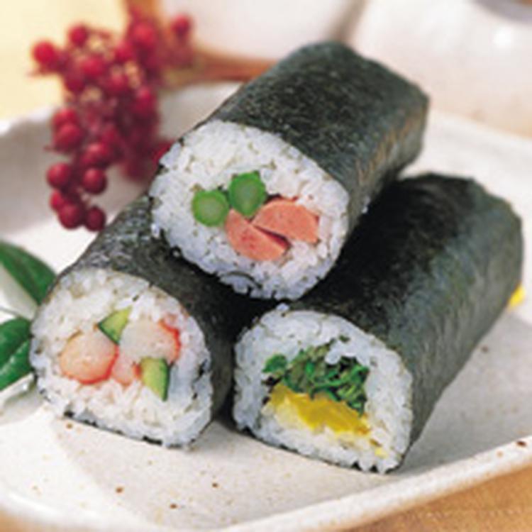 同様にして、(ソーセージとアスパラ、マヨネーズ)、(千切りしたたくあんと貝割れ菜)を巻いてそれぞれ半分に切る。好みでしょうゆを添えても良い。