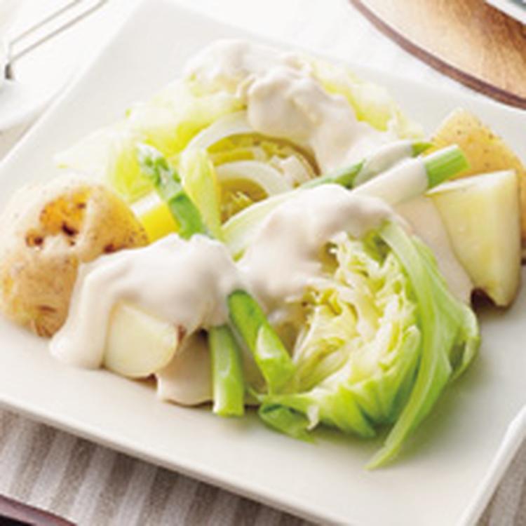 厚めのビニール袋に、(3)のじゃがいもを入れ、電子レンジ(600W)で4分間加熱する。同じビニール袋に(1)のキャベツ、(2)のアスパラガスを加え、さらに2分間加熱する。