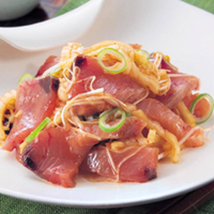 キムチは3~4mm幅の千切り、白ねぎは白い部分のみを3~4cm長さに切り、縦に切り目を入れて表面の皮だけを2~3枚とって千切りし、水にさらす。白ねぎの残った部分は小口切りにする。