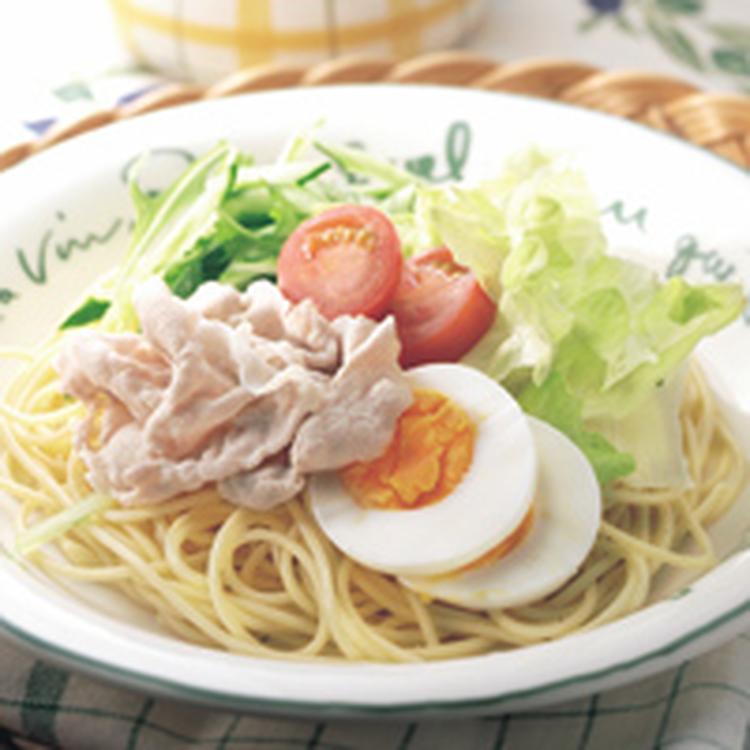 スパゲティは袋の表示通りに茹でる。茹で上がったら流水で冷やし水気をきる。Aをボウルに合わせ、(1)を入れて和え、冷蔵庫で冷やしておく。