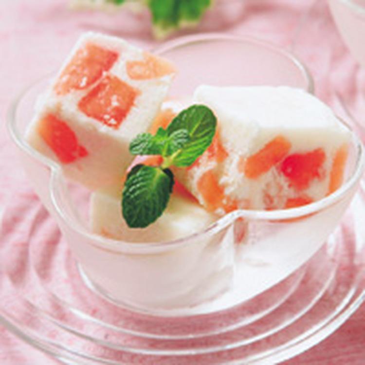 (2)に(3)のメレンゲを加えてゴムベラでさっくりと混ぜ合わせ、準備しておいたバットに流し入れる。冷凍庫でしっかり冷やし固め、食べやすい大きさに包丁で切る。