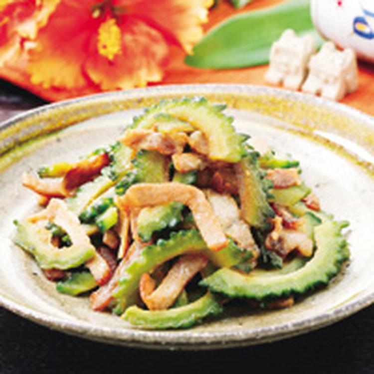ゴーヤはワタと種を取り除き、5mm位の斜め切りにする。沸騰させたお湯に塩をひとつまみ入れ、切ったゴーヤをさっと茹でて一旦冷水にとり、ザルにあげ水気をきっておく。