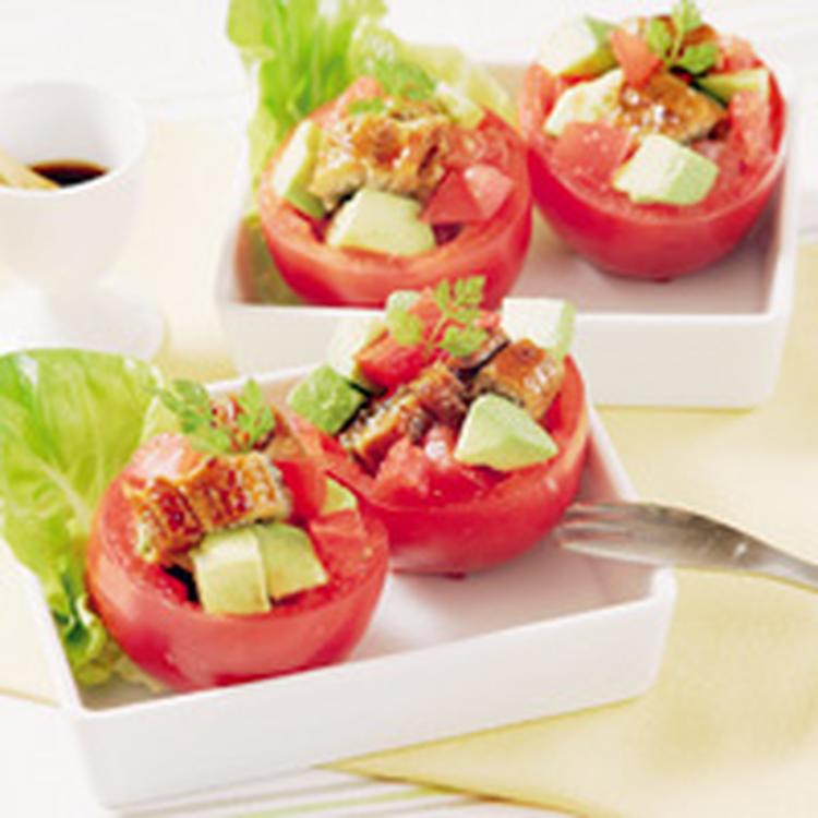 ボウルに粗みじんにしたトマトと(2)、(3)を入れて混ぜ合わせ、くり抜いたトマトカップに盛り付ける。うなぎのタレ適量をかけていただく。