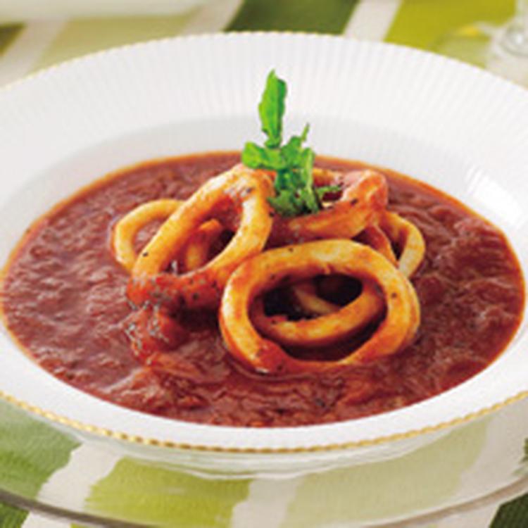 取り出したフライパンで、玉ねぎを透き通るまで炒め、(2)のトマト、Aを加え、10分程煮詰めたら、(4)のいかを戻し、しばらく煮込む。塩、こしょうで味を調える。