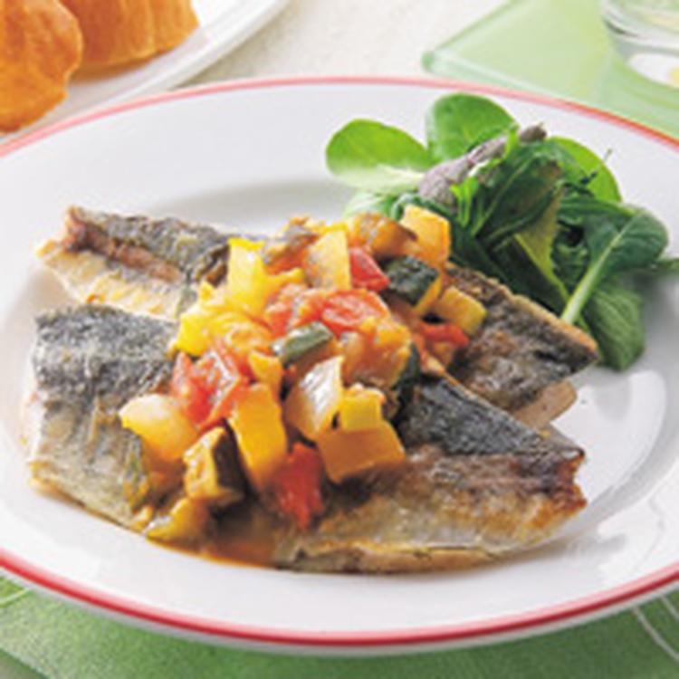フライパンにオリーブオイル大さじ2を入れ、(1)のあじの水気を拭いたものに小麦粉をまぶして焼く。両面にこんがりと焼き目がついたら取り出す。