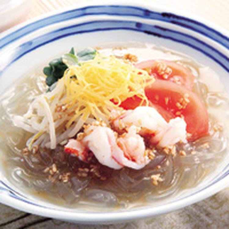 器にところてんを4等分して盛り、(1)~(3)の具材を彩り良く盛り付ける。(4)のタレをかけていただく。
