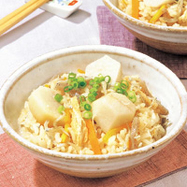 炊飯器に洗った米、調味料を入れ、普通に炊く水量線まで水を加える。里芋、ちりめんじゃこ、油揚げ、こんにゃく、人参を加えてスイッチを入れ、普通に炊く。