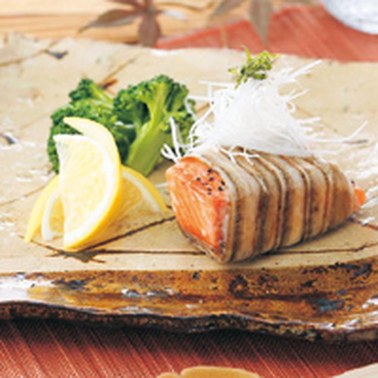 薄くスライスしたごぼうを縦に少しずつ重ねながら鮭の幅分並べる。小麦粉を薄くふり、その上に(1) をのせ、巻き終わりが下になるように巻いていく。