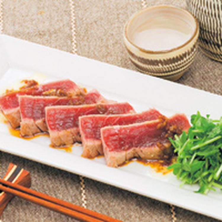 まぐろの表面に塩、こしょうをし、オリーブオイル(分量外)でさっと焼き、そぎ切りにする。
