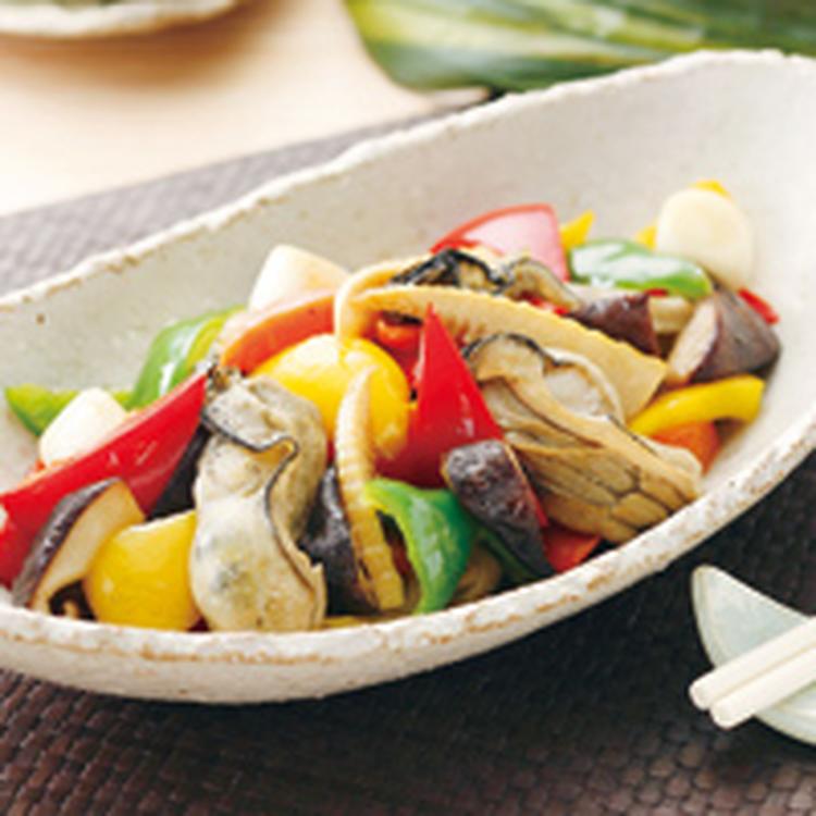 フライパンにごま油を熱し、人参、たけのこ、長ねぎ、ピーマン、パプリカ、しいたけの順序で硬い食材から炒める。火が通ったら、(3)のかきを加えてすばやく炒め、酒をふり入れ、Aを加えて炒める。