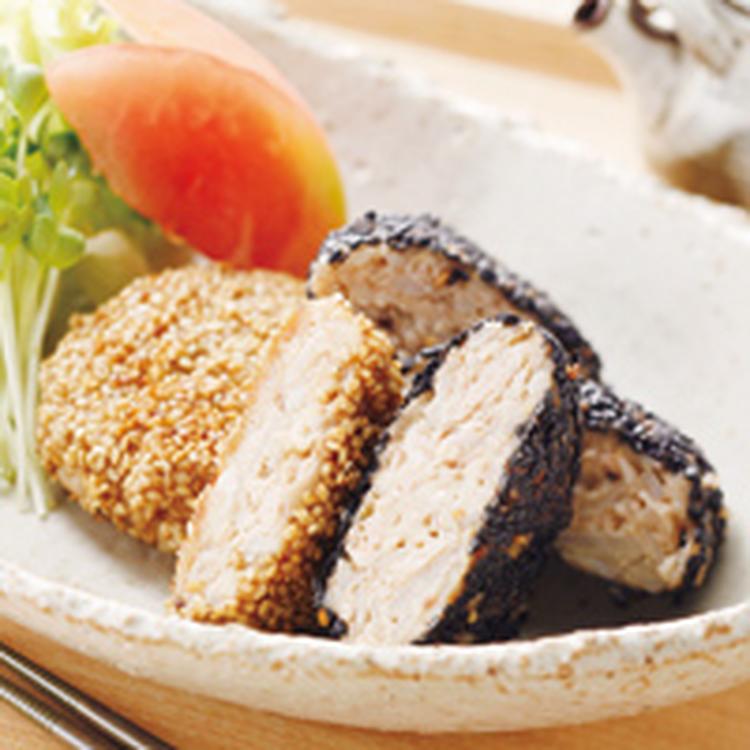 フライパンにサラダ油を熱し、(4)を中火で表面にうっすら焦げ目がつくくらいに焼いたら裏返し、ふたをして5分ごまが焦げないように注意しながら蒸し焼きにし、日本酒をふり入れたら火を止め、ふたをして5~6分放置しておく。