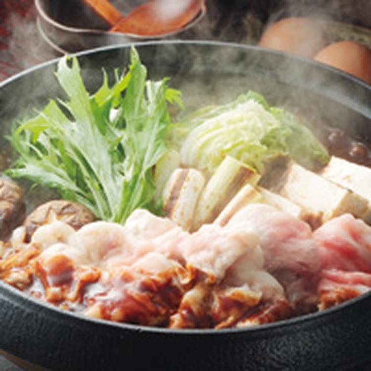 野菜に火が通り始めたら、豚ロース肉を適量加えて火を通す。火が通ったものから取り分け、卵黄をつけながらいただく。味が薄くなってきたら(4)を加え、煮詰まりすぎた時は酒適量を加える。