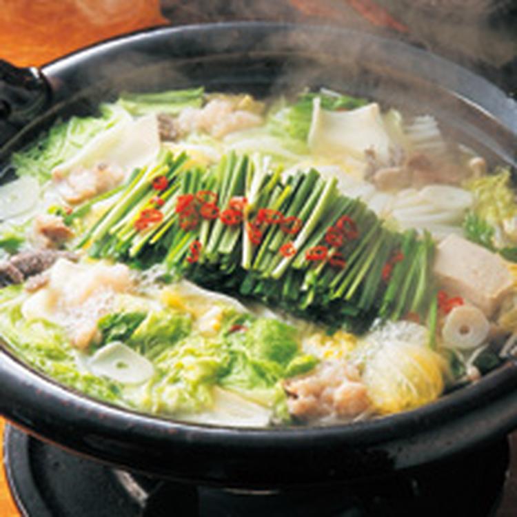 鍋に牛ホルモンを1/2量入れ、白菜、えのき、豆腐、にら、餃子の皮、にんにく、赤唐辛子の順に1/2量ずつ重ねていく。鍋の7分目くらいまで (3)のスープを注ぐ。