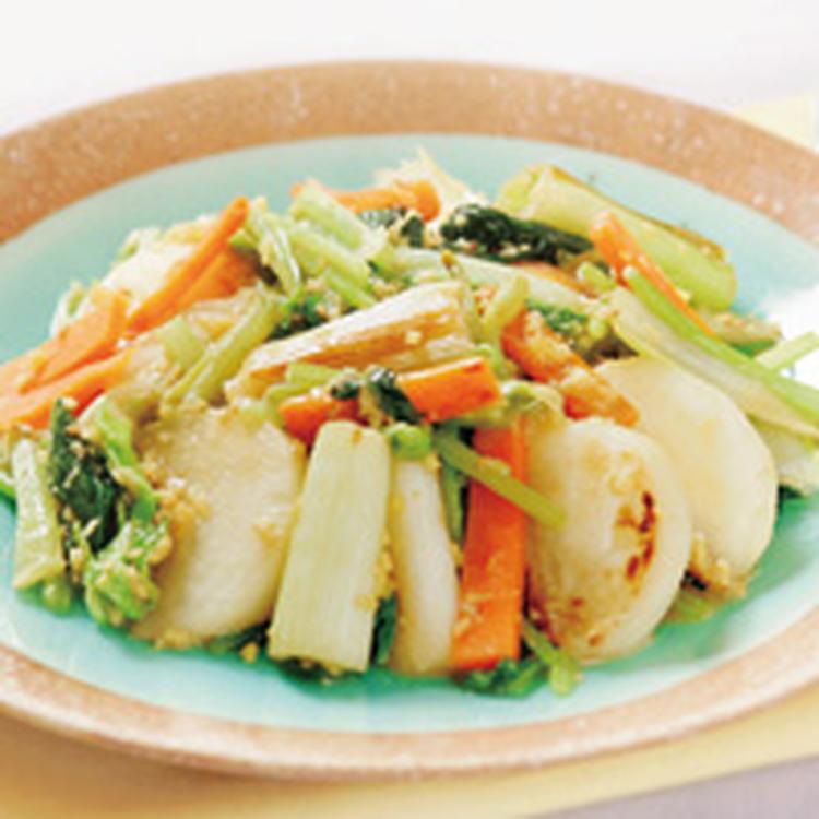 フライパンに適量の油を入れて熱する。火の通りにくい野菜から順に、強火で炒める。野菜に火が通ったら、(1)を加えてざっと混ぜ合わせる。味をみて塩少々で調味し、器に盛り付ける。