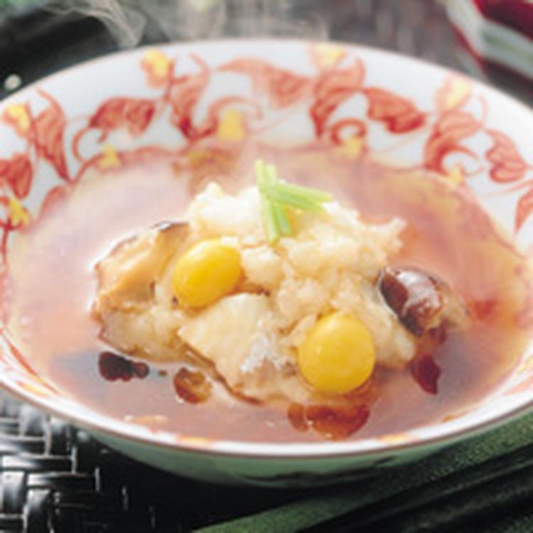 蒸し上がった(5)に(6)をたっぷりかけて、三つ葉を添える。熱いうちにいただく。
