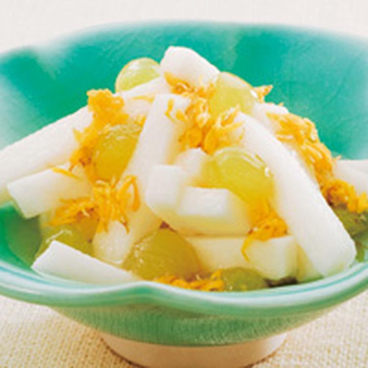 水気を軽く絞り、長いも・ぶどう・Aを加えてあえる。