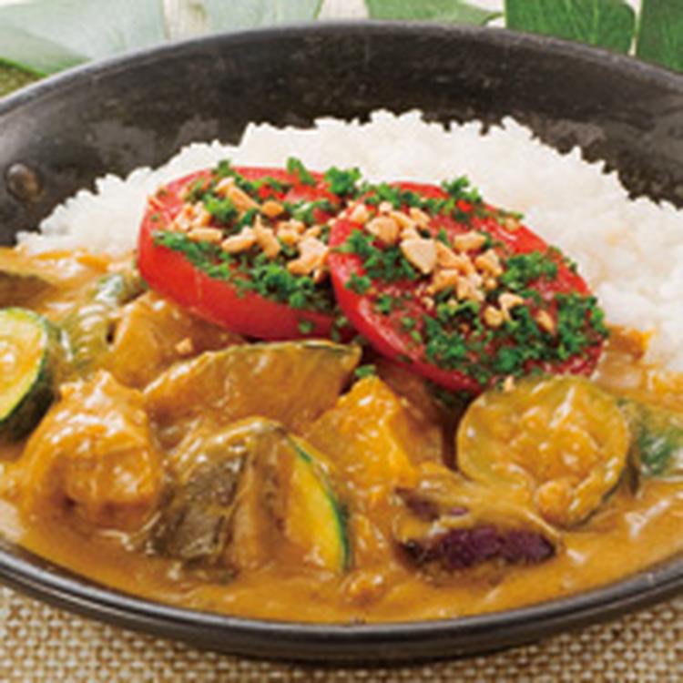 器にご飯をよそい、(3)をかける。パセリをまぶしたトマトをのせ、ピーナッツを散らす。